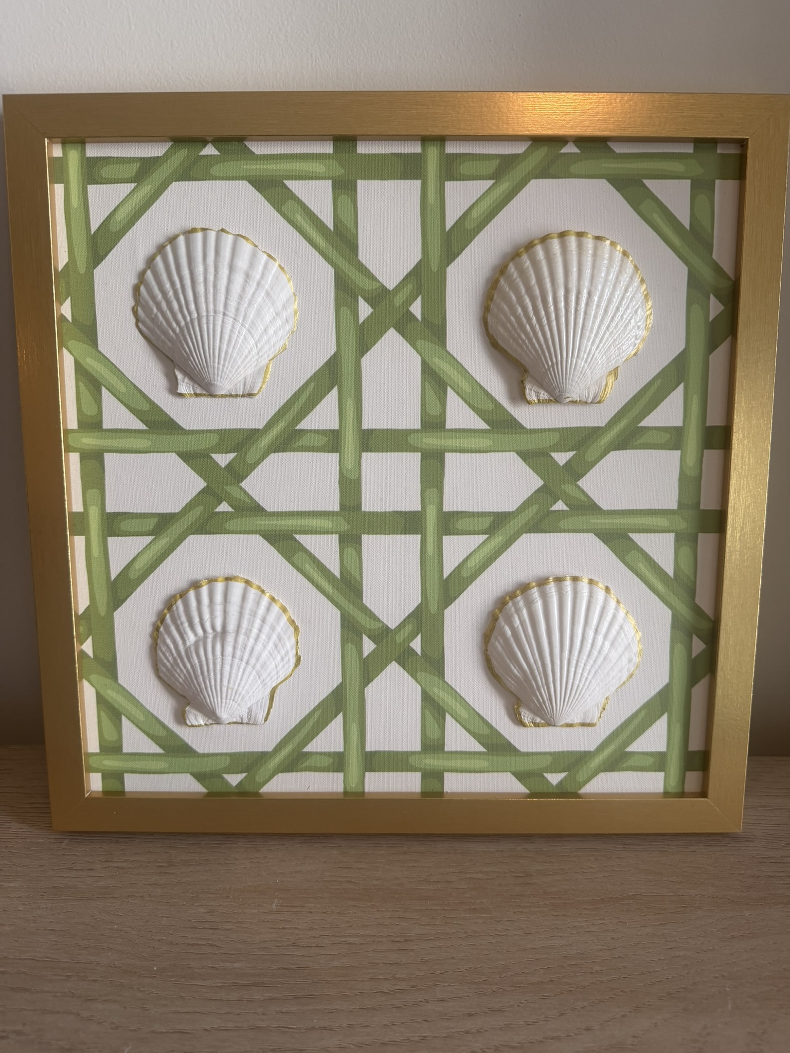 Gold-Rimmed White Scallop Quartet on Green Bamboo Lattice