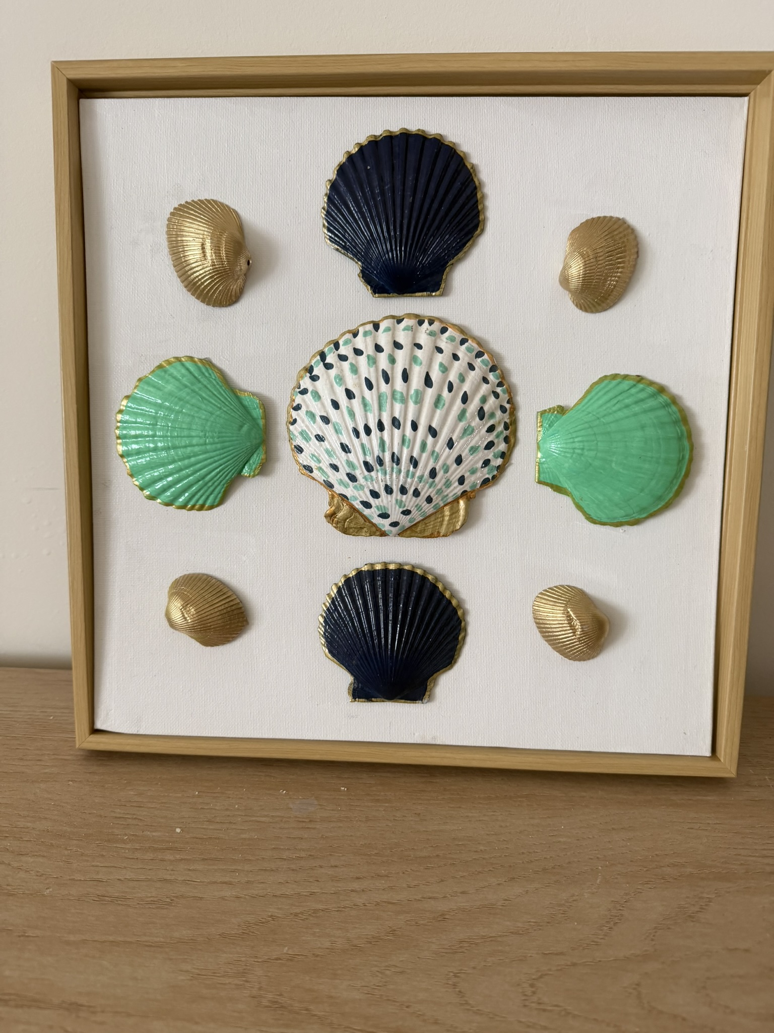 White Scallop Duo on Blue Floral Stripe in Green Beaded Frame