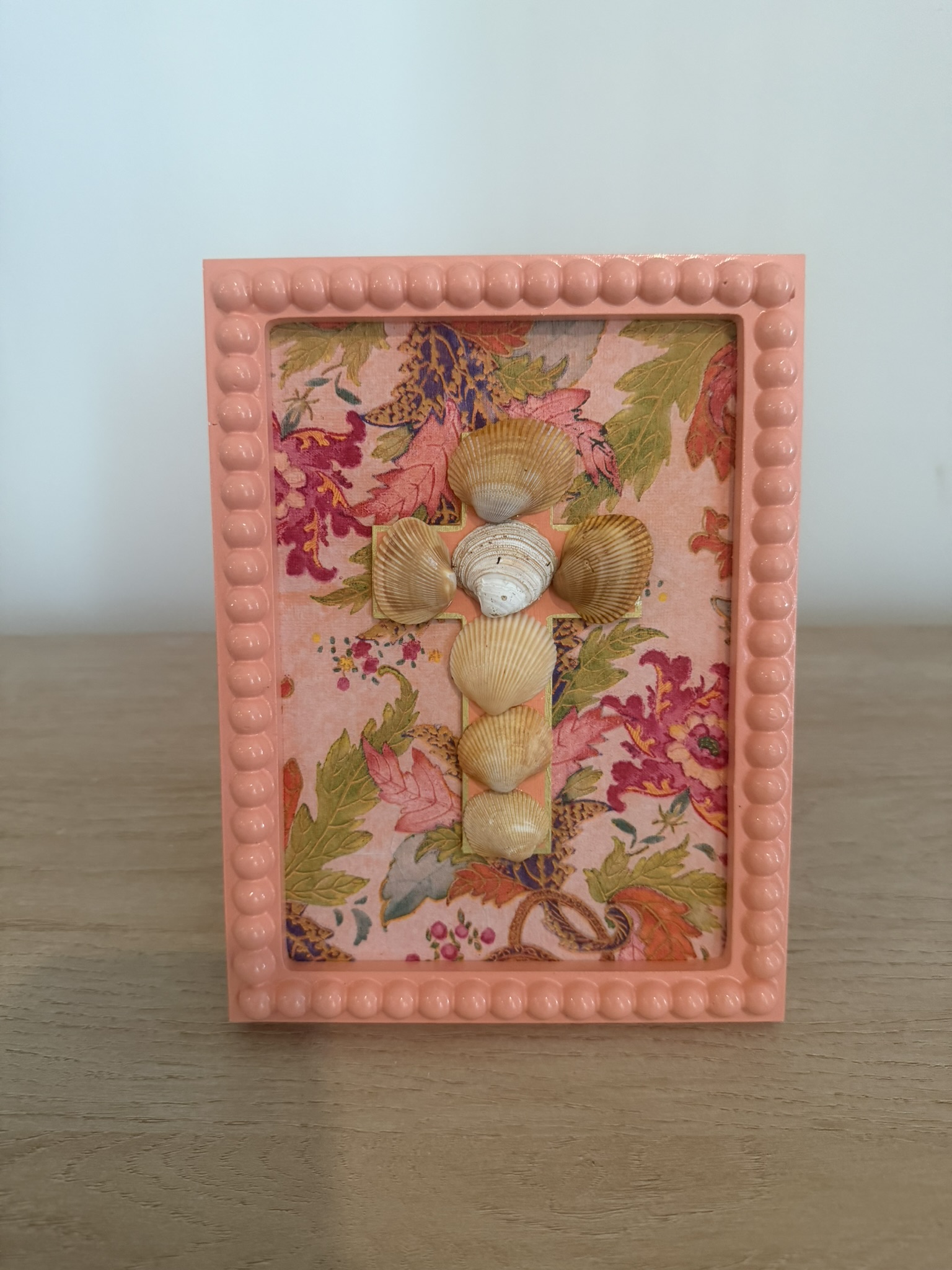 Shell Cross on Autumn Floral in Peach Beaded Frame
